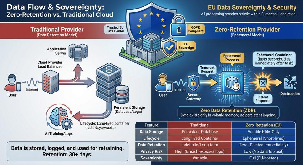 • Zero Retention: Data discarded post-response. No prompts stored, no fine-tuning loops.
