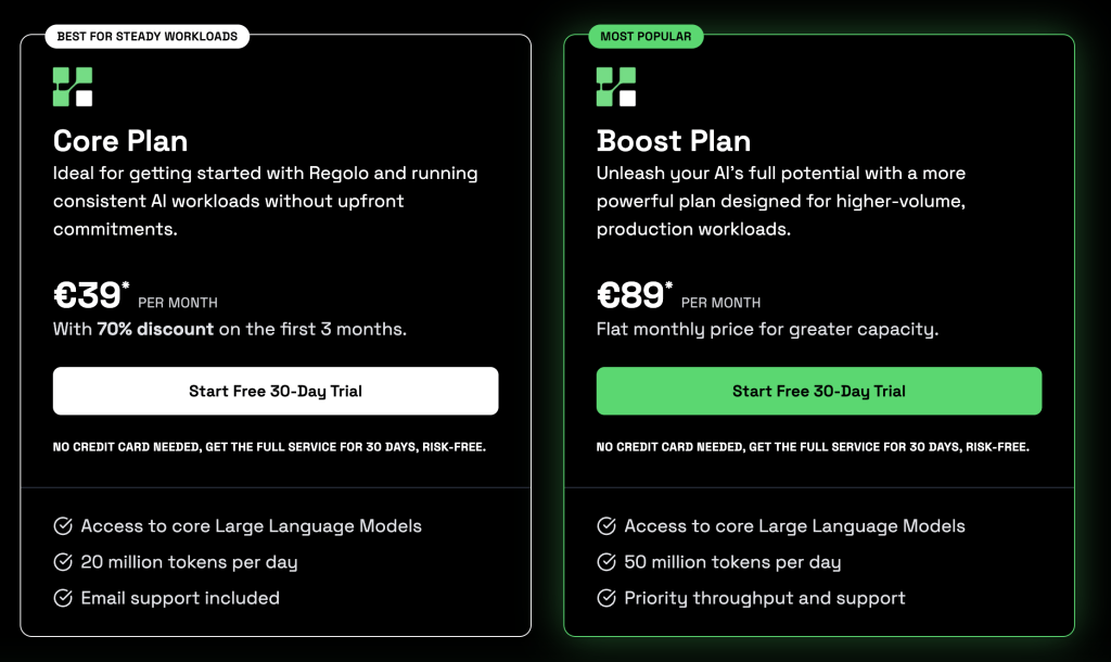 Regolo offers a Core Plan with 20 million tokens per day and a Boost Plan with 50 million tokens per day, with priority throughput. For teams with moderate AI usage, this can be significantly more cost-effective—especially when combined with the ability to run smaller models locally for simple completions.